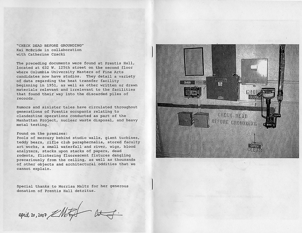The first two photographs show a hole in Catherine Czacki’s studio that connects the basement to the studio floors above. Catherine and I decided to work together to produce a 60 page booklet that addressed the rumors and facts about what the building had been used for over the years. We gave away the booklet during the show.